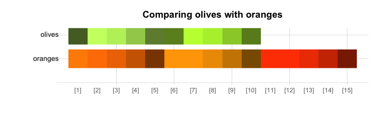 is used with a recognized keyword or a list of color palettes, the function displays a comparison between them. When only some colors of a color palette are requested, the seecol()