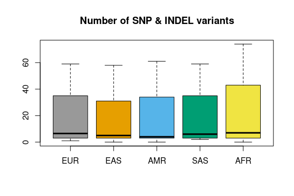 res vcfplot(res, pop = popfile, col = 1:5, main = "Number of SNP & INDEL variants")