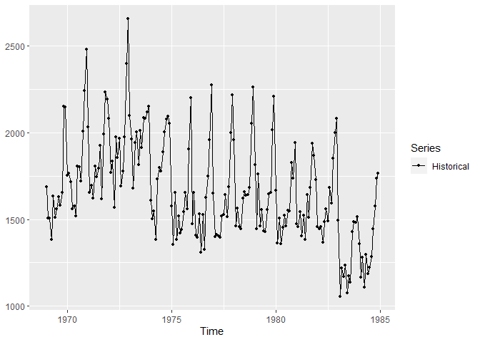 timeS <- window(USAccDeaths, end = c(1977, 12)) # historical values